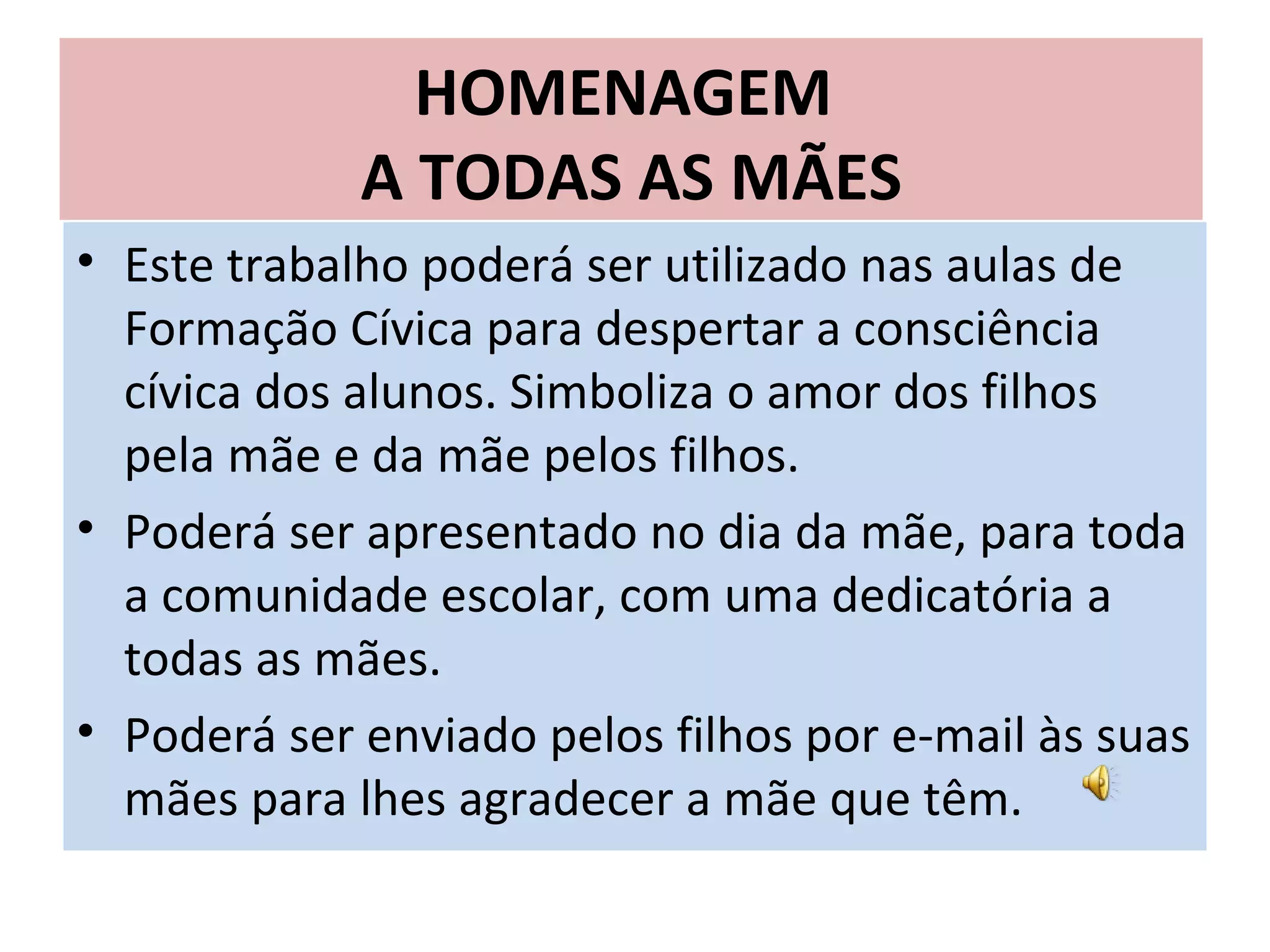 Este documento é uma homenagem à relação entre mães e filhos, destacando o amor incondicional das mães. Descreve momentos desde o nascimento dos filhos, como segurar nos seus pés e colo, até à sua independência futura, sempre com a mãe presente e oferecendo apoio.