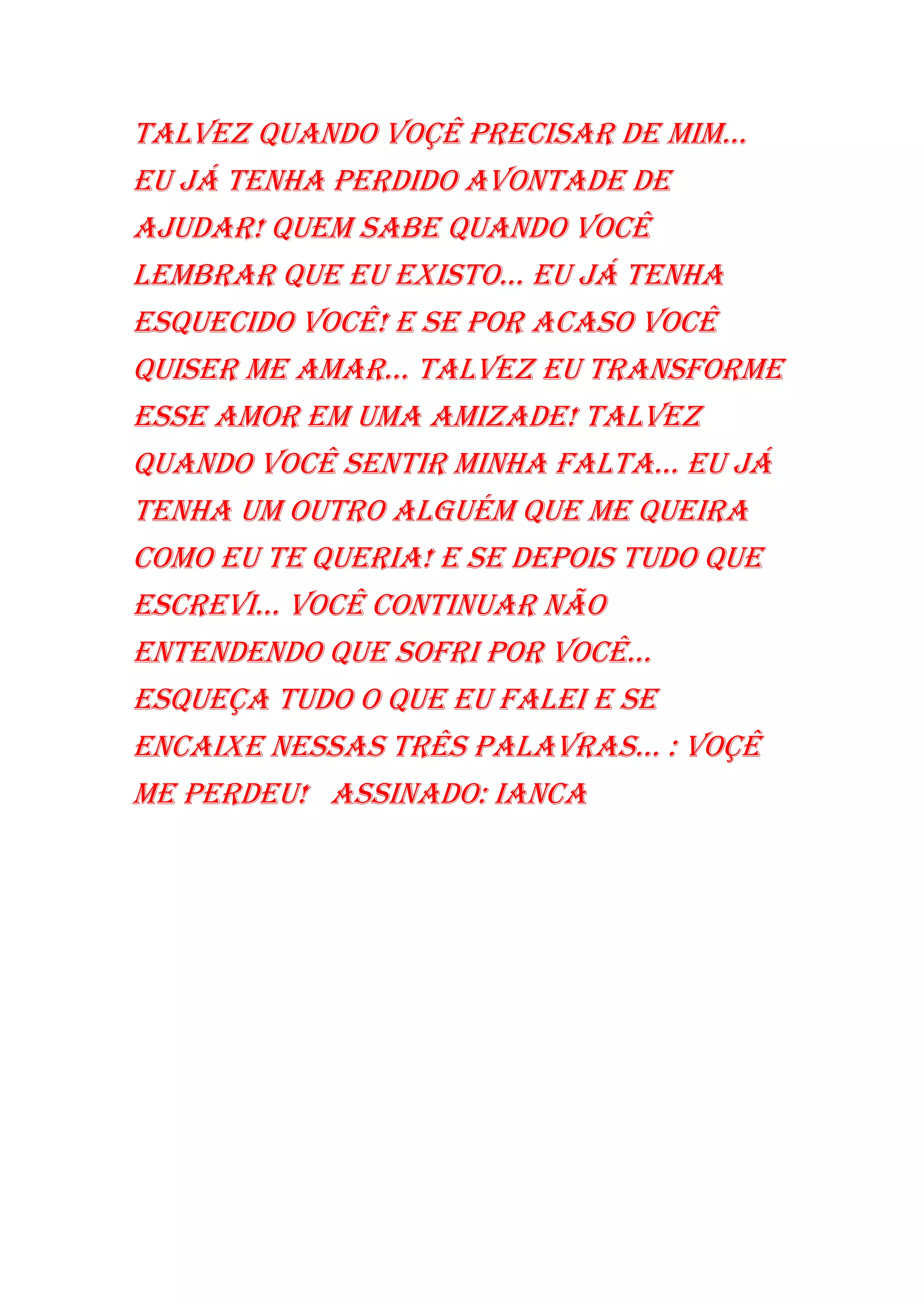 Uma pessoa escreve uma carta para alguém que perdeu o interesse nela, dizendo que quando essa pessoa precisar dela novamente, ela pode ter perdido o interesse em ajudar, e que se um dia quiserem seu amor, ela pode ter transformado em amizade ou encontrado outra pessoa.