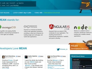 O documento aborda o desenvolvimento de aplicações web modernas utilizando a pilha MEAN, que inclui MongoDB, Express.js, AngularJS e Node.js, destacando as vantagens do MongoDB como uma base de dados NoSQL, especialmente em termos de escalabilidade e flexibilidade. Além disso, discute a história e características do Node.js, enfatizando sua eficiência e aplicabilidade em diferentes tipos de aplicações. O texto também introduz AngularJS como um framework poderoso para criação de aplicações web dinâmicas, detalhando suas principais funcionalidades.