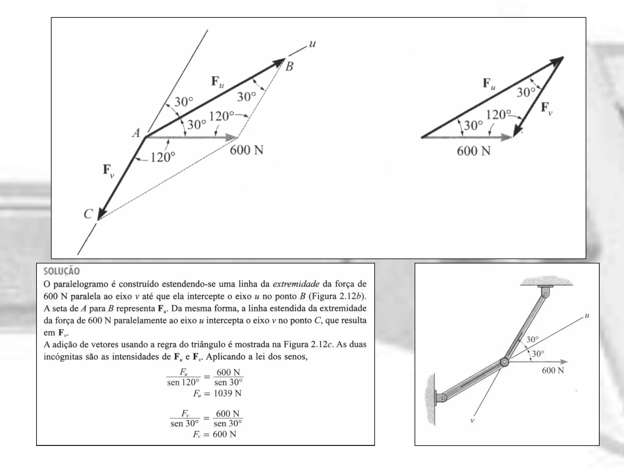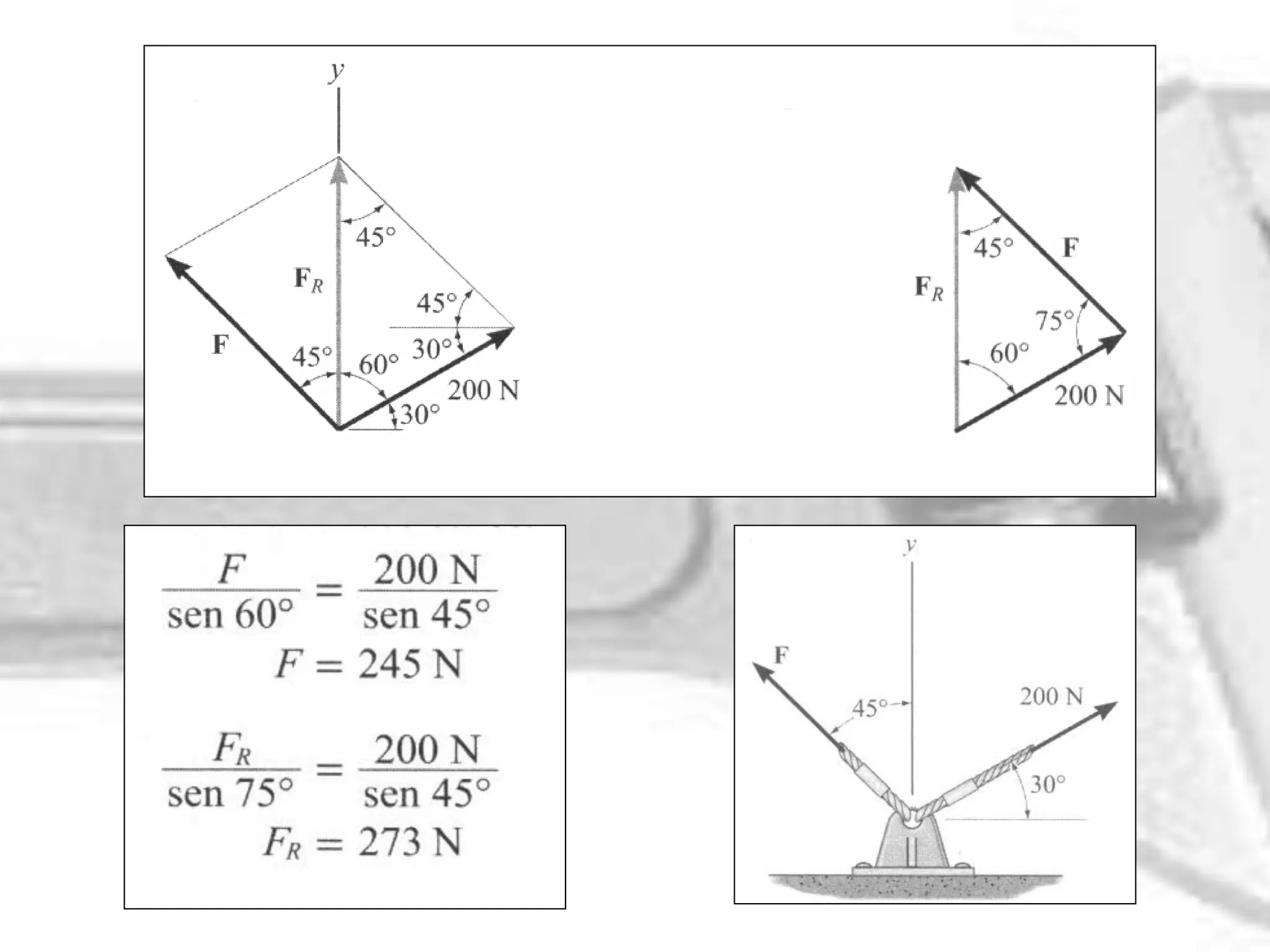 O documento discute vetores de força, multiplicação e adição de vetores. Explica que a multiplicação de um vetor por um escalar positivo aumenta sua intensidade, enquanto por um escalar negativo muda sua direção. Também apresenta exemplos de adição de vetores usando a lei do paralelogramo e do triângulo. Por fim, explica um exemplo sobre determinar a intensidade mínima, ângulo e força resultante para que a força sobre uma argola seja direcionada ao longo do eixo x positivo.