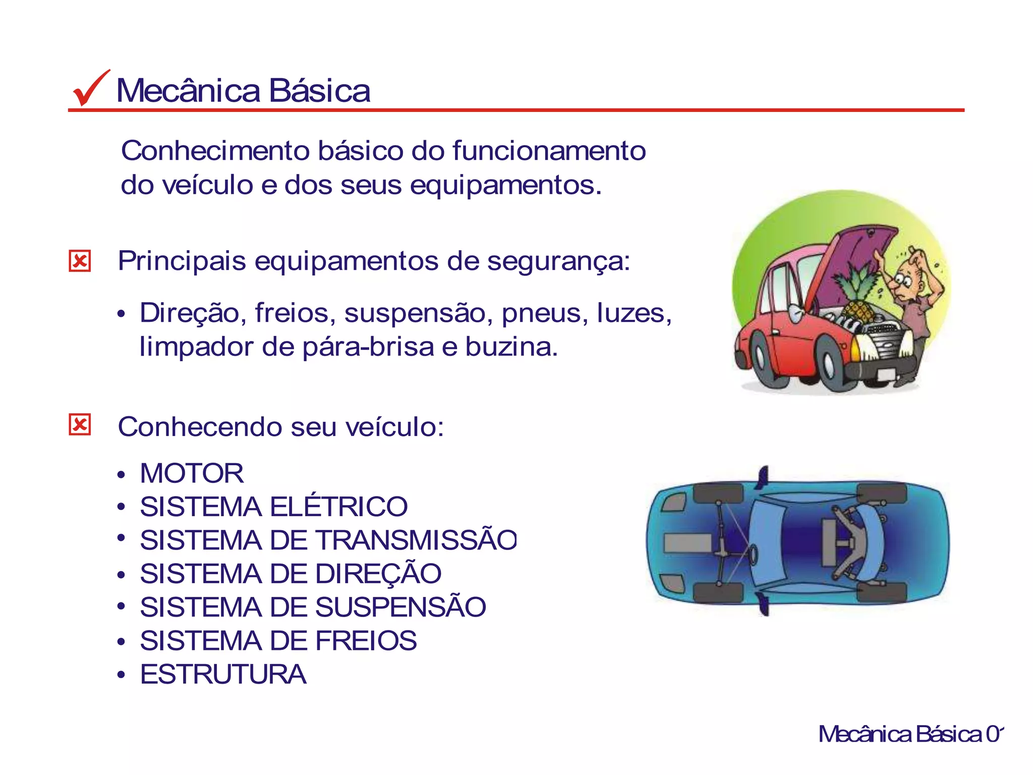 O documento fornece informações sobre os principais sistemas e equipamentos de um veículo, incluindo motor, sistema elétrico, transmissão, direção, suspensão, freios, estrutura e equipamentos de segurança. É destacada a importância da manutenção periódica para garantir o bom funcionamento e segurança do veículo.