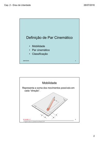 O documento discute conceitos fundamentais de mecanismos, incluindo mobilidade, pares cinemáticos, elos, cadeias cinemáticas, graus de liberdade e representação de mecanismos através de grafos. Exemplos ilustram como calcular o grau de liberdade de diferentes mecanismos usando o critério de Gruebler. Exercícios práticos são fornecidos no final.