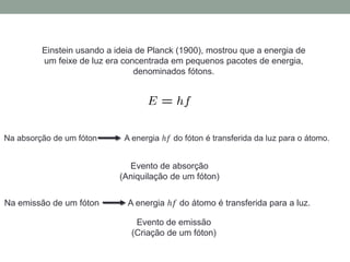 1) O documento discute a mecânica quântica e como a luz é quantizada em pacotes de energia chamados fótons. 2) A luz pode ser absorvida ou emitida por átomos através da transferência de energia dos fótons. 3) A dualidade onda-partícula da luz é explicada através de experimentos como a dupla fenda.