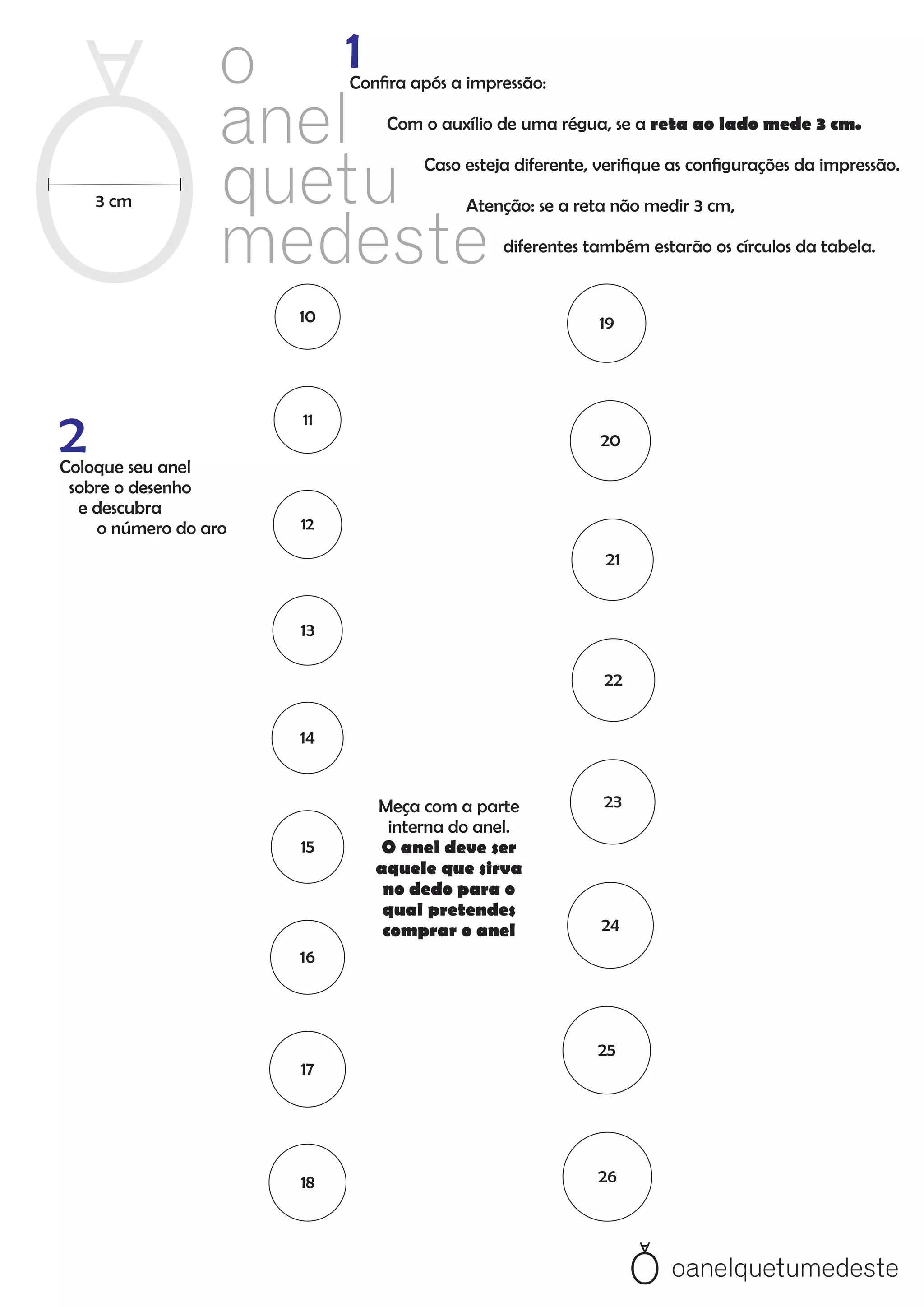 O documento instrui o leitor a usar uma régua para medir uma linha de 3 cm impressa e verificar as configurações da impressão caso a medida esteja incorreta. Avisa que os círculos de uma tabela também estarão incorretos se a linha não medir 3 cm. Instrui também a colocar um anel sobre um desenho para descobrir o número do aro e medir com a parte interna do anel, devendo ser aquele que sirva no dedo.