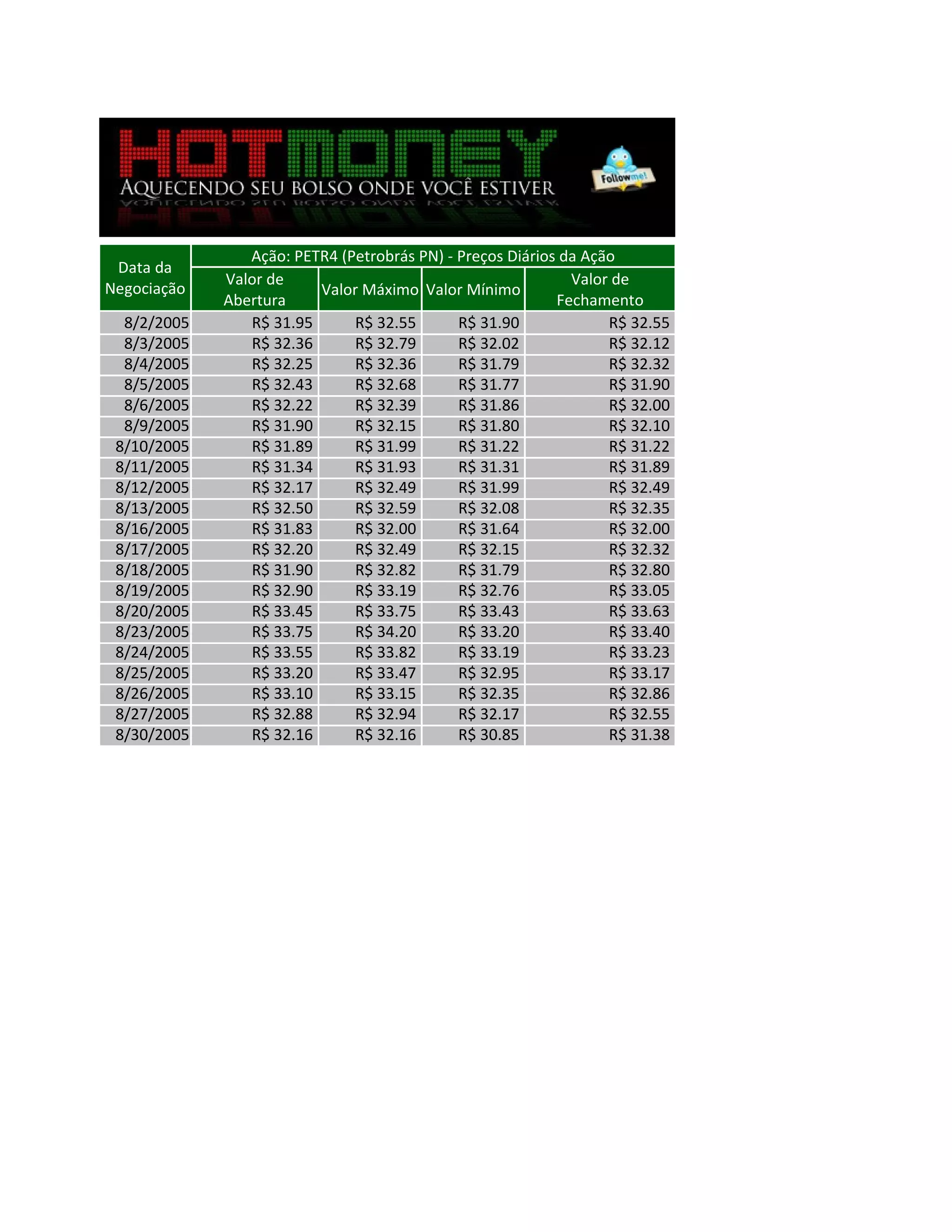 O documento apresenta os preços diários da ação PETR4 (Petrobrás PN) em agosto de 2005, incluindo os valores de abertura, máximo, mínimo e fechamento para cada dia de negociação, além da média ponderada da ação no período.