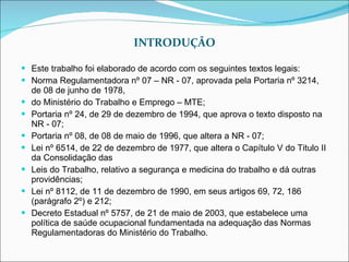 O documento discute as leis e normas regulamentadoras relacionadas à saúde e segurança no trabalho no Brasil. Ele também descreve o Programa de Controle Médico de Saúde Ocupacional (PCMSO) que especifica procedimentos para proteger a saúde dos empregados baseado nos riscos do ambiente de trabalho.