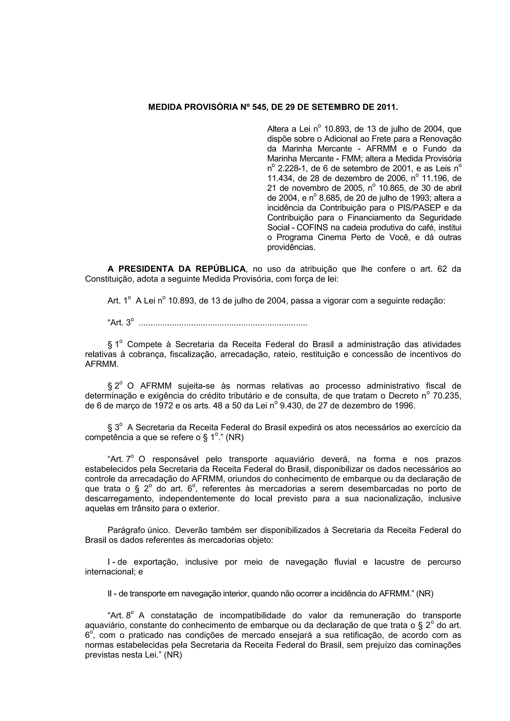Este documento altera leis relacionadas a impostos sobre o transporte marítimo e café, institui um programa de cinema, e fornece créditos tributários temporários na cadeia produtiva do café. Ele modifica leis sobre taxas de transporte marítimo, regras de isenção e compensação de impostos sobre receitas de café.