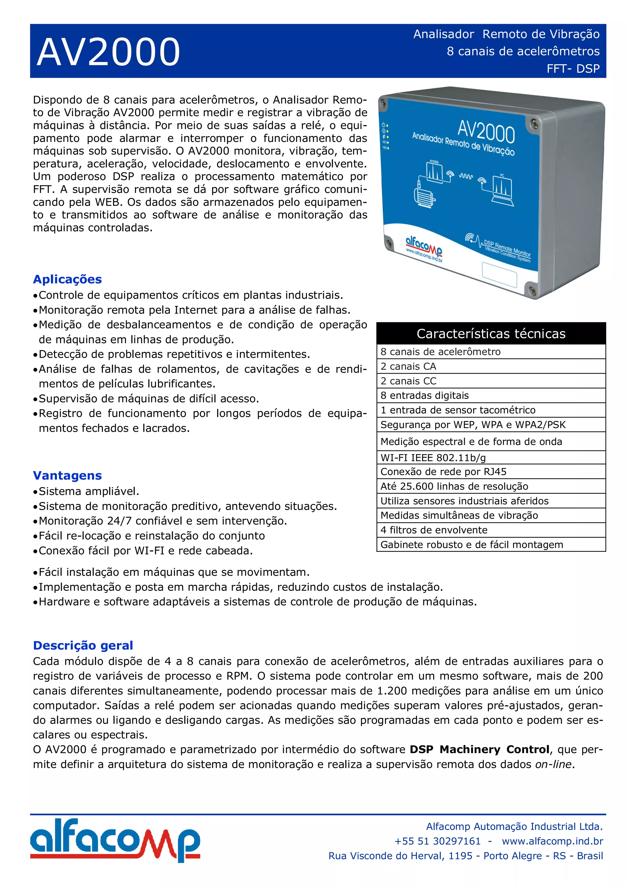 O analisador remoto de vibração AV2000 permite medir e registrar a vibração de máquinas à distância, utilizando 8 canais de acelerômetros e um DSP para processamento matemático. Ele monitora múltiplas variáveis e alerta para falhas, sendo adequado para controle de equipamentos industriais e supervisão remota via software. O sistema é programável, ampliável e possibilita medições simultâneas, garantindo monitoramento 24/7.