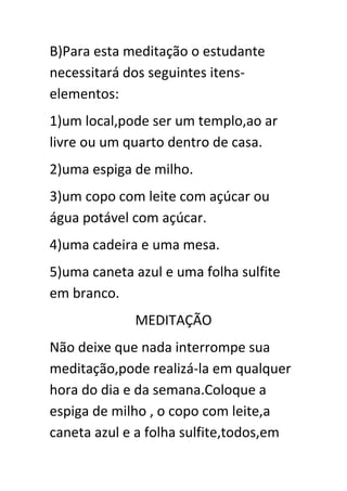 Este documento descreve uma meditação para que o praticante possa se tornar uma pessoa idealizada, com uma personalidade mágica e protegida. Ele instrui o praticante a escolher 10 tipos de personalidades desejadas e visualizar-se como essas personalidades e como figuras místicas como Bafomet e uma vespa, bebendo leite ou água para completar a meditação. Avisa que a meditação pode ser repetida e funciona através da técnica de assunção, levando a resultados.