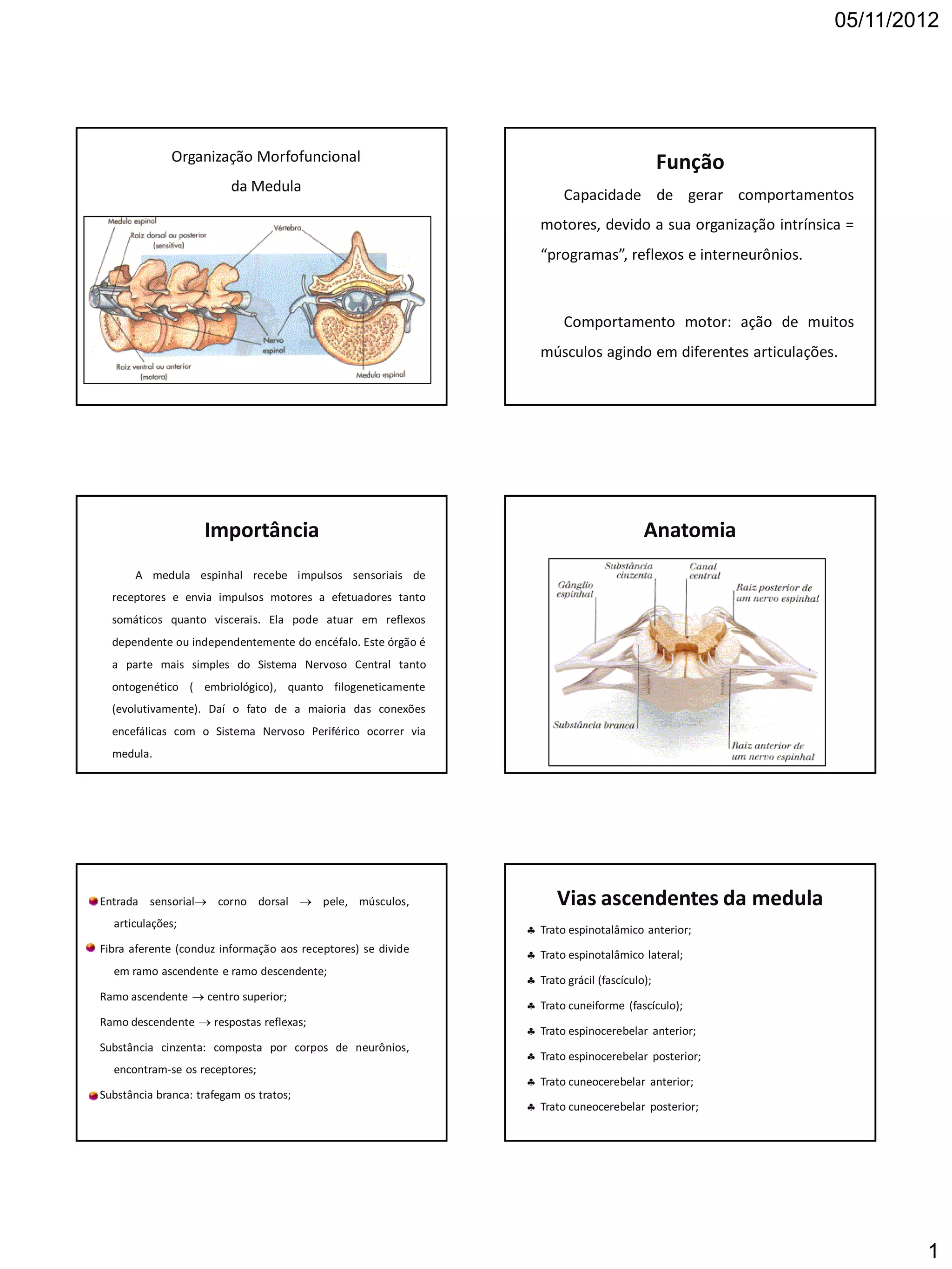 O documento descreve a organização e função da medula espinhal, incluindo sua capacidade de gerar comportamentos motores através de programas, reflexos e interneurônios. Detalha as vias ascendentes e descendentes da medula, os tipos de neurônios e circuitos presentes, e como a medula controla a locomoção através da contração alternada de músculos flexores e extensores.