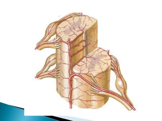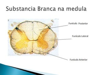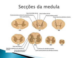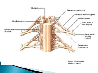 A medula espinhal é uma massa cilindróide de tecido nervoso situada dentro da coluna vertebral. Ela mede aproximadamente 45 cm no adulto e apresenta duas dilatações chamadas intumescências cervical e lombar, onde se conectam nervos. A medula é envolvida pelas meninges - dura-máter, aracnóide e pia-máter - e contém 31 pares de nervos espinhais.