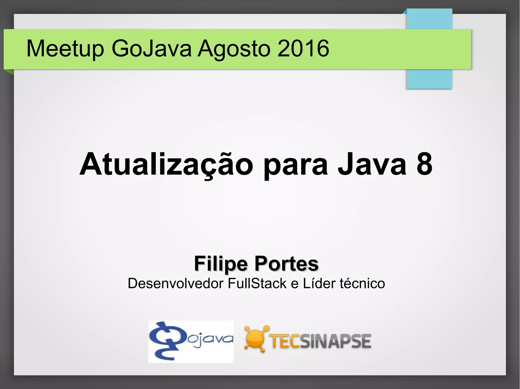 O documento apresenta uma palestra sobre as principais novidades da atualização do Java para a versão 8, incluindo interfaces funcionais, lambda expressions, métodos default, Stream API e Collectors, nova API de datas java.time e remoção do PermGen space.