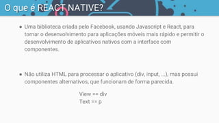 O documento introduz React Native, uma biblioteca criada pelo Facebook para desenvolvimento de aplicativos móveis usando Javascript e React, permitindo criar interfaces nativas com componentes reutilizáveis. A biblioteca não usa HTML, mas possui componentes como View e Text, e folhas de estilo em Javascript para estilização. O documento também discute por que usar React Native, empresas que o usam e preparação do ambiente de desenvolvimento.