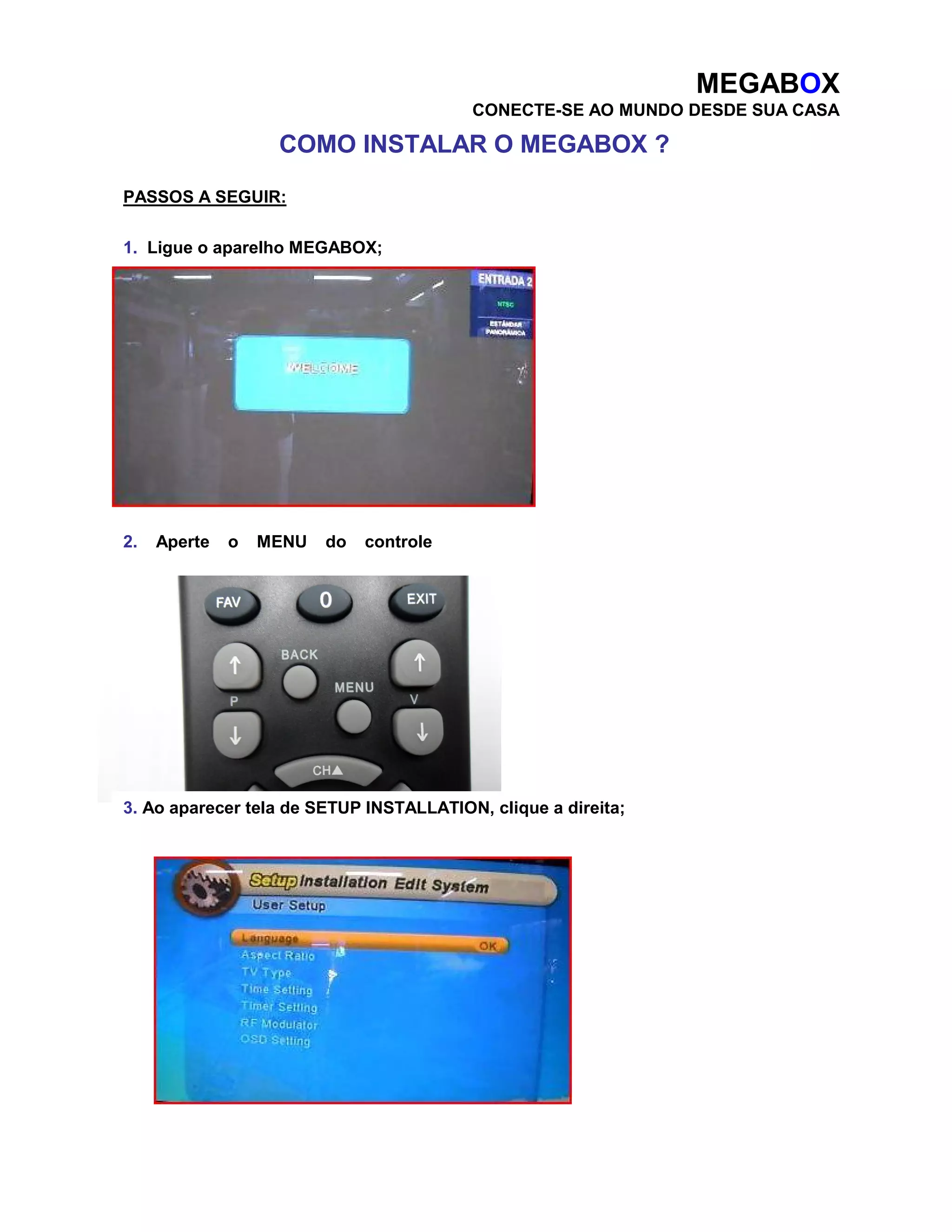 O documento fornece instruções passo a passo para instalar o aparelho MegaBox, começando com a ligação do aparelho e configuração da antena para receber sinais do satélite Amazonas, seguido pelos passos para escanear as frequências corretas e canais, e finalizando com a atualização do firmware via USB.