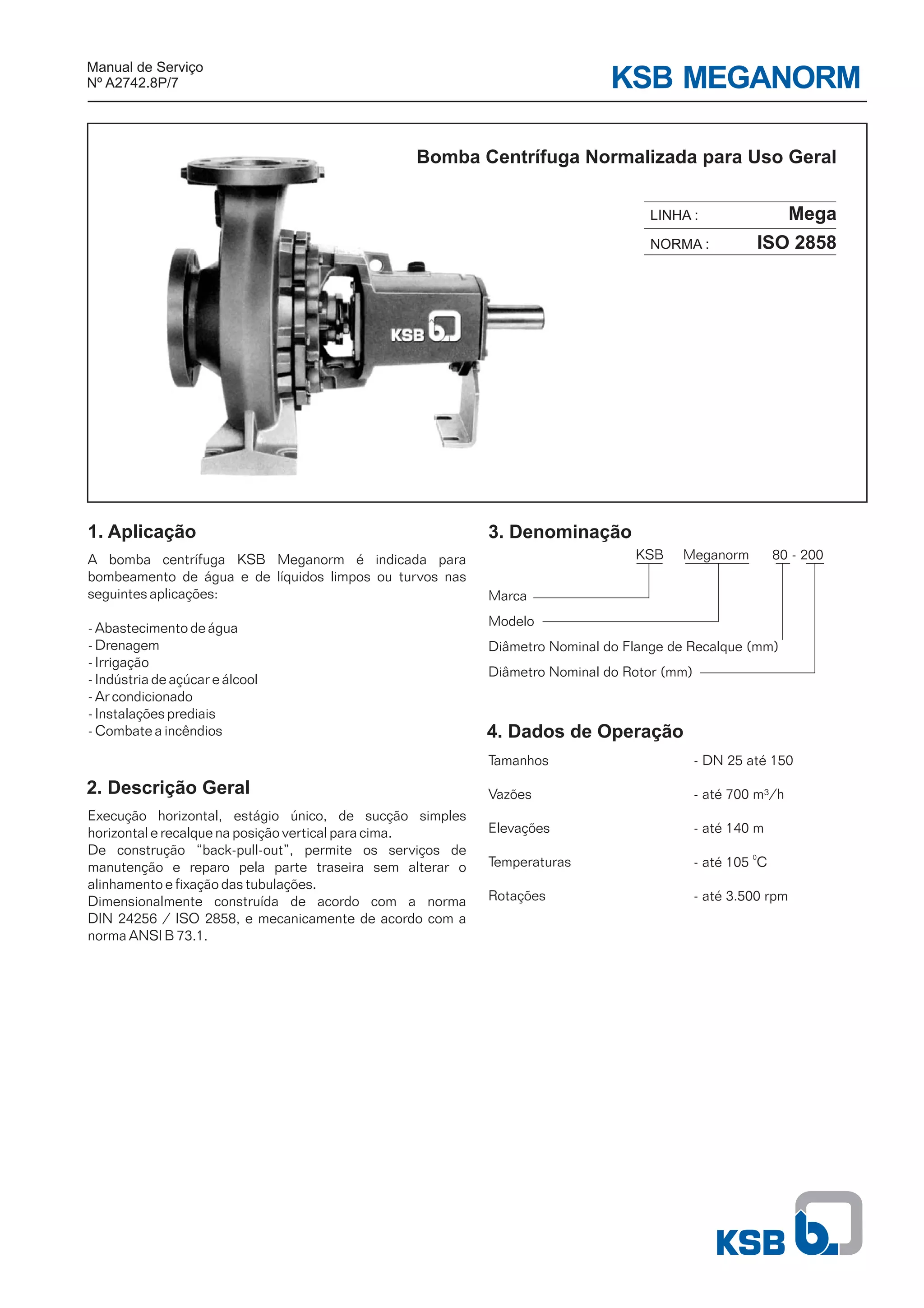 O documento fornece instruções sobre a bomba centrífuga KSB Meganorm, incluindo seus dados técnicos, transporte, conservação, instalação e operação. Detalha os procedimentos para o transporte, armazenamento e conservação da bomba, assim como a instalação correta no local, incluindo a preparação da base e o nivelamento.