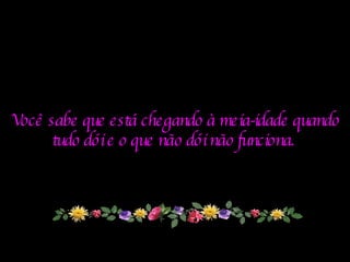 O documento descreve vários aspectos da meia-idade, como dores no corpo, diminuição da libido e energia, ganho de peso na cintura, dificuldade de ler cardápios à luz de velas e esquecimento de nomes e rostos. Também aborda como na meia-idade passamos a criticar mais a geração nova do que a velha e saber todas as respostas, mas não ser mais perguntado.