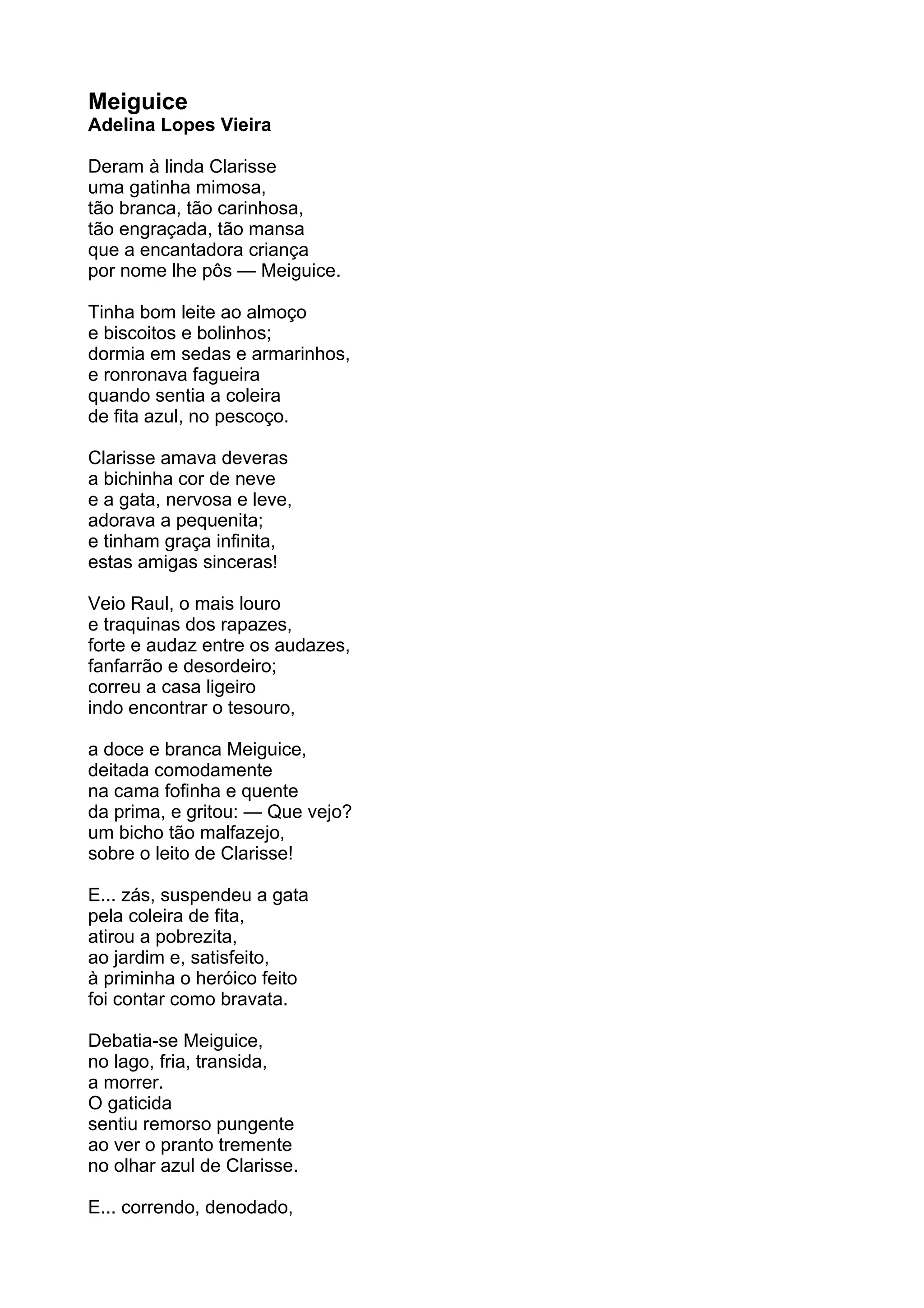 A menina Clarisse ganhou uma gatinha muito mansa chamada Meiguice. Um dia, o primo Raul, brincalhão, jogou Meiguice no lago para assustar Clarisse, quase afogando o gato. Arrependido, Raul salvou Meiguice da água e pediu perdão a Clarisse.
