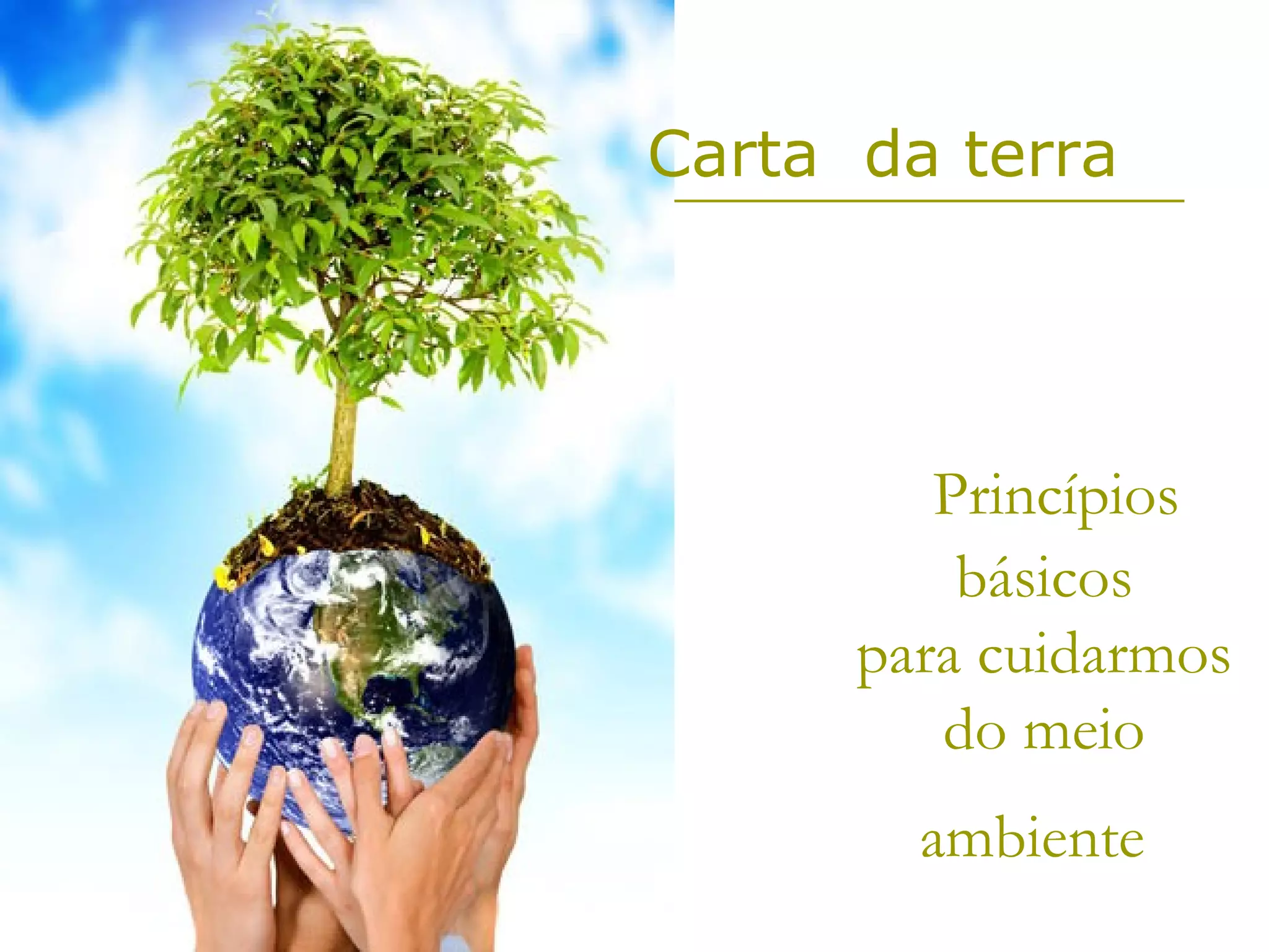 O documento apresenta os princípios da Carta da Terra, que incluem: 1) prevenir danos ambientais e assumir precaução quando o conhecimento for limitado; 2) reduzir, reutilizar e reciclar; e 3) proteger a diversidade biológica e processos naturais que sustentam a vida.