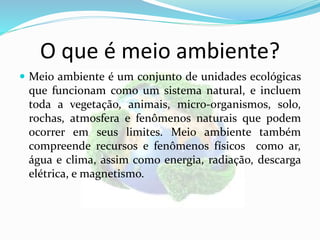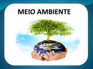 O documento discute o meio ambiente, sua definição e importância. Ele também aborda a poluição ambiental, seus tipos e formas de prevenção, incluindo a reciclagem. O Dia Mundial do Meio Ambiente é celebrado em 5 de junho para conscientizar as pessoas sobre a necessidade de proteger o meio ambiente.