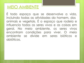 O documento discute vários tópicos relacionados ao meio ambiente, incluindo: 1) a definição de meio ambiente e responsabilidade ambiental; 2) a importância da sustentabilidade, saneamento básico e reciclagem; 3) os impactos da poluição, aquecimento global e desmatamento; 4) a escassez de recursos hídricos e formas de evitar o desperdício de água.