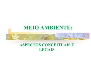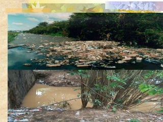 O documento discute conceitos e aspectos legais relacionados ao meio ambiente, abordando definições de meio ambiente, tipos de ambientes, educação ambiental e leis ambientais brasileiras como a Política Nacional do Meio Ambiente e o Protocolo de Kyoto. O documento também analisa problemas ambientais como a poluição hídrica e a degradação do Rio Poty em Teresina através de fotos e explicações sobre as causas e impactos da eutrofização.