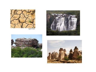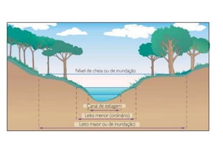 O documento descreve os principais elementos associados ao relevo e dinâmica das bacias hidrográficas. Apresenta o conceito de relevo e suas formas principais como planaltos, montanhas e planícies. Descreve também os processos de erosão pelos diferentes agentes e as fases do curso de um rio, desde a nascente até a foz.