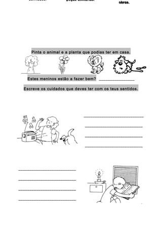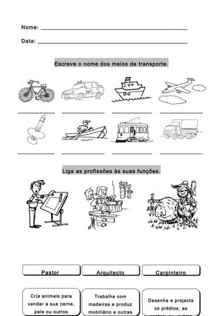 Este documento pede aos estudantes para completar várias tarefas, incluindo: listar meios de transporte, associar profissões às suas funções, pintar animais ou plantas que podem ter em casa, escrever cuidados com os sentidos, e listar meios de comunicação pessoal e social.