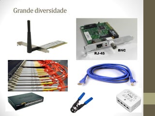 O documento discute os diferentes tipos de meios de transmissão de dados em redes, incluindo cabos de par trançado, coaxial e fibra ótica. O cabo de par trançado é o mais comum devido ao seu baixo custo e facilidade de instalação, enquanto a fibra ótica permite transmissões a longas distâncias com pouca perda de sinal.