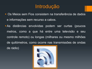 O documento discute vários tipos de tecnologias sem fio, incluindo micro-ondas, rádio, infravermelho e laser. Ele lista vantagens e desvantagens de cada tecnologia e explica como cada uma funciona para a transmissão de dados sem o uso de cabos.