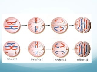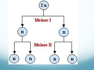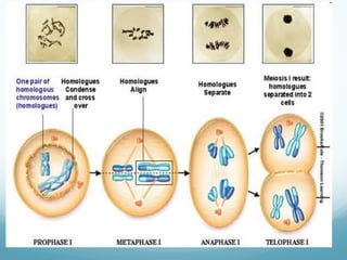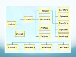 O documento descreve as etapas da meiose, que incluem zigóteno, paquíteno, diplóteno, diacinese, metáfase I, anáfase I, telófase I e meiose II, resultando na formação de quatro células haplóides com metade do número de cromossomos da célula original. A meiose envolve a separação dos cromossomos homólogos paternos e maternos e a divisão das cromátides irmãs para produzir gametas com número reduz
