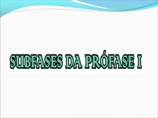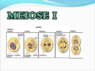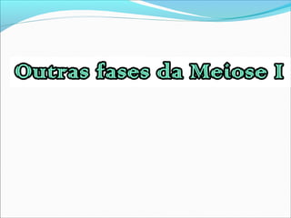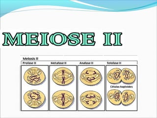 A meiose é um tipo de divisão celular em duas etapas que produz quatro células haploides a partir de uma célula diploide original. A meiose consiste na primeira divisão meiótica, onde os cromossomos homólogos se separam, e a segunda divisão meiótica, onde as cromátides irmãs se separam, resultando em quatro células haploides no final do processo. O documento descreve em detalhe as várias fases da prófase, metáfase, anáfase e telófase que ocor