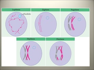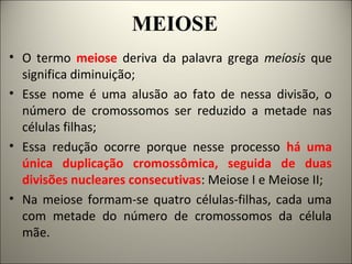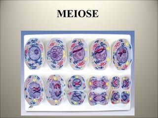 O documento descreve o processo de meiose, que resulta na formação de quatro células-filhas haplóides através de duas divisões nucleares sucessivas (Meiose I e Meiose II) após uma única duplicação cromossômica na célula mãe diploide original. A meiose inclui as fases de prófase, metáfase, anáfase e telófase em cada uma das divisões, resultando no emparelhamento e troca de material genético entre cromossomos homólogos.