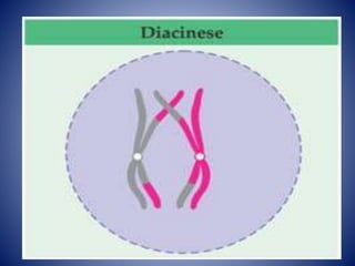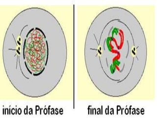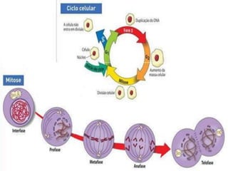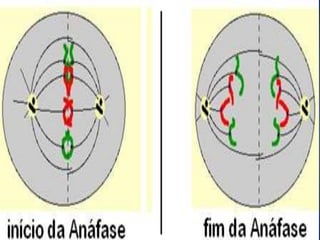 A mitose e a meiose são processos de divisão celular. A mitose produz duas células filhas idênticas com o mesmo número de cromossomos da célula mãe e ocorre na reprodução de seres unicelulares e no crescimento de seres pluricelulares. A meiose reduz a metade o número de cromossomos e gera quatro células haplóides a partir de uma célula diplóide original.