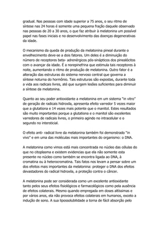 A melatonina é um hormônio produzido principalmente à noite pela glândula pineal que funciona como um poderoso antioxidante, protegendo as células e o DNA contra danos causados por radicais livres. Sua produção diminui com a idade, o que pode contribuir para o desenvolvimento de doenças degenerativas, e ela tem sido usada com sucesso no tratamento de distúrbios do sono e como coadjuvante no tratamento de depressão e ansiedade.