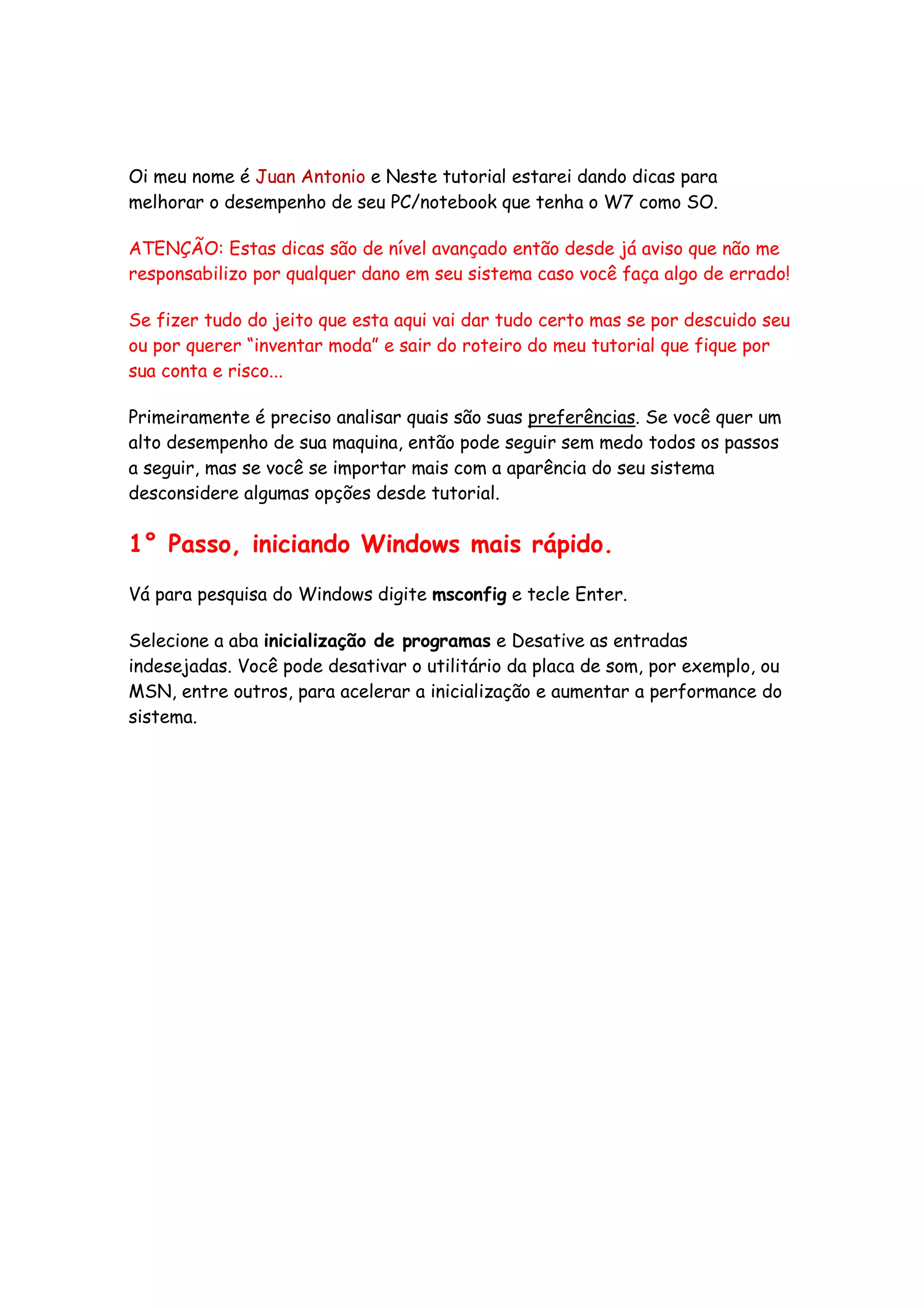 O documento fornece 10 dicas para melhorar o desempenho de PCs com o Windows 7, incluindo desativar efeitos visuais, sons, serviços desnecessários e desabilitar atualizações automáticas para acelerar o sistema. O autor adverte que as dicas são de nível avançado e não se responsabiliza por possíveis danos ao sistema.