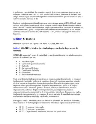 O MPS.BR é um modelo de melhoria de processo para empresas de software brasileiras baseado nos padrões internacionais ISO/IEC 12207 e ISO/IEC 15504. Ele fornece um caminho de maturação em sete níveis para as empresas e assessoria mais barata do que certificações estrangeiras. O objetivo é disseminar o modelo no Brasil e em outros países da América Latina.