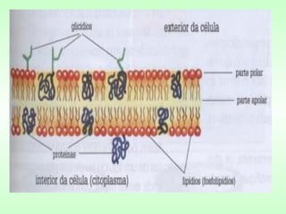 O documento descreve as características e composição da membrana plasmática das células animais e vegetais. A membrana é formada por lipídios e proteínas e controla o que entra e sai da célula através de processos passivos como difusão e osmose ou ativos que requerem energia. A membrana também contém proteínas transportadoras importantes.
