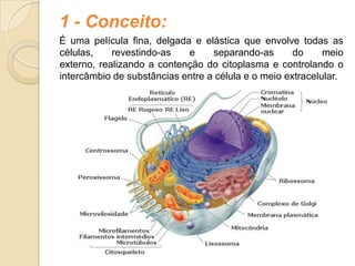A membrana plasmática envolve todas as células e controla o intercâmbio de substâncias entre a célula e o meio externo. É composta por uma dupla camada de lipídios com proteínas e carboidratos. Realiza funções como regulação da troca de substâncias, proteção do conteúdo celular e permeabilidade seletiva.