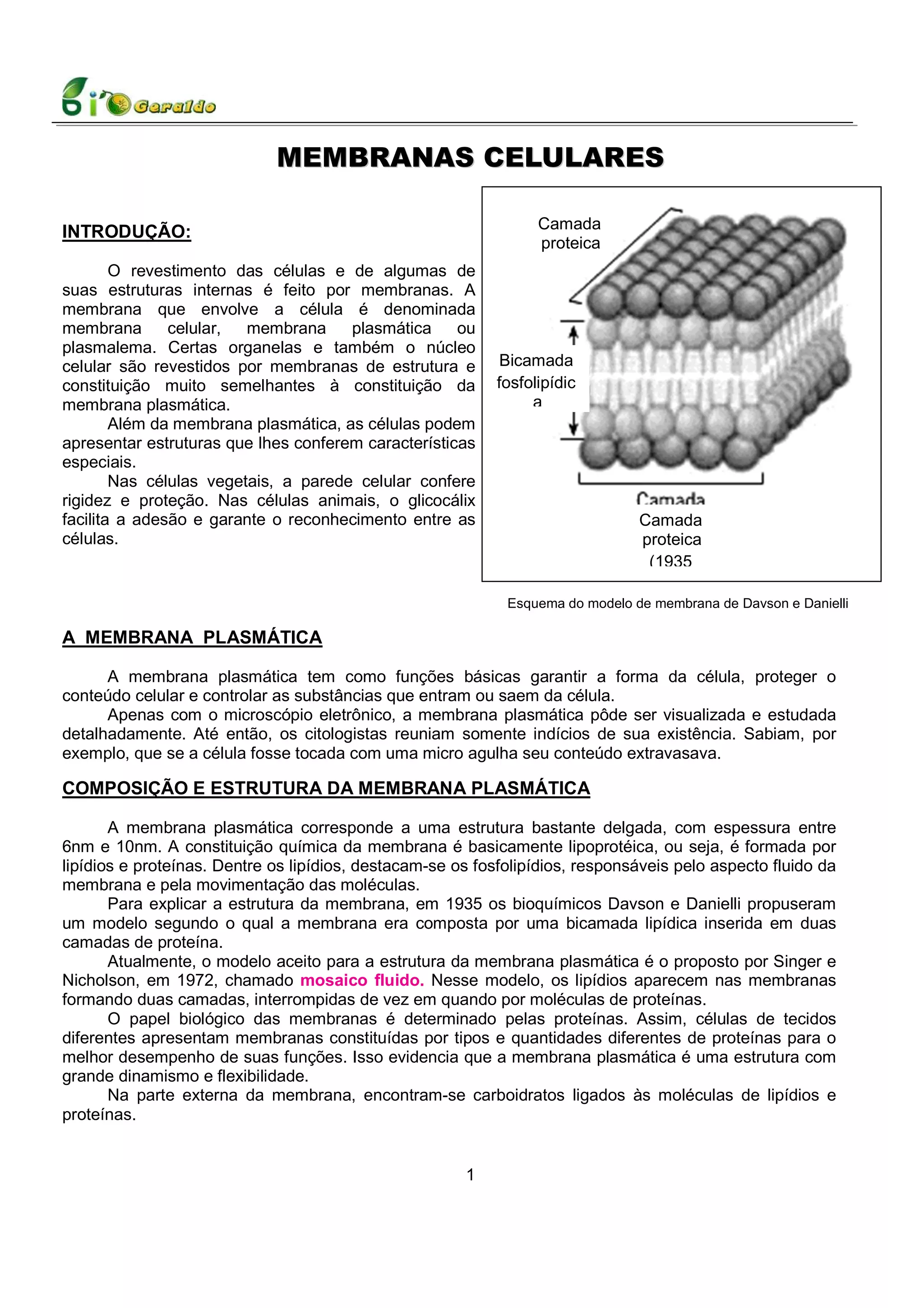 O documento descreve a estrutura e função da membrana celular. A membrana é formada por uma bicamada de fosfolipídios com proteínas inseridas. Ela controla o que entra e sai da célula através de transporte passivo e ativo. A osmose é o transporte passivo de água através da membrana de acordo com os gradientes de concentração.