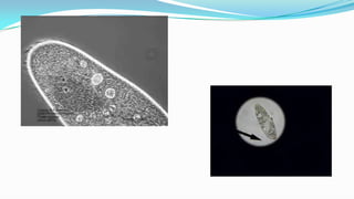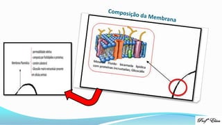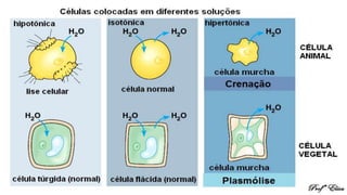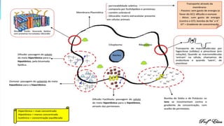 Este documento descreve a estrutura celular básica e os tipos de transporte através da membrana plasmática, incluindo difusão simples, osmose e transporte ativo. Explica que a difusão simples ocorre sem gasto de energia enquanto o transporte ativo usa bombas de sódio e potássio que requerem ATP. Também discute a importância da concentração de solutos e a diferença entre meios hipertônicos, hipotônicos e isotônicos.