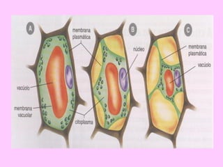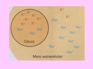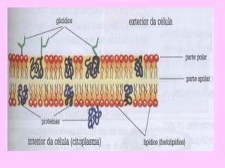 O documento descreve as características e processos da membrana plasmática das células animais e vegetais. A membrana plasmática é formada por lipídios e proteínas e protege a célula enquanto permite o transporte seletivo de substâncias através dela por processos passivos como difusão e osmose ou ativos como bombas de íons. A membrana também permite a entrada e saída de substâncias pela endocitose, exocitose e fagocitose/pinocitose.