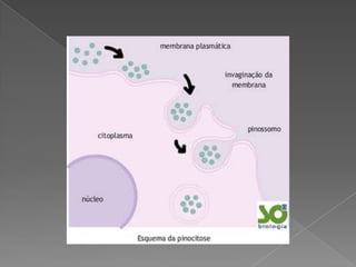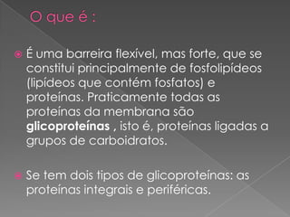 O documento descreve a estrutura e funções da membrana plasmática, incluindo que é composta principalmente de fosfolipídeos e proteínas, controla a entrada e saída de substâncias nas células, e possui transporte passivo e ativo através de canais iônicos e proteínas.