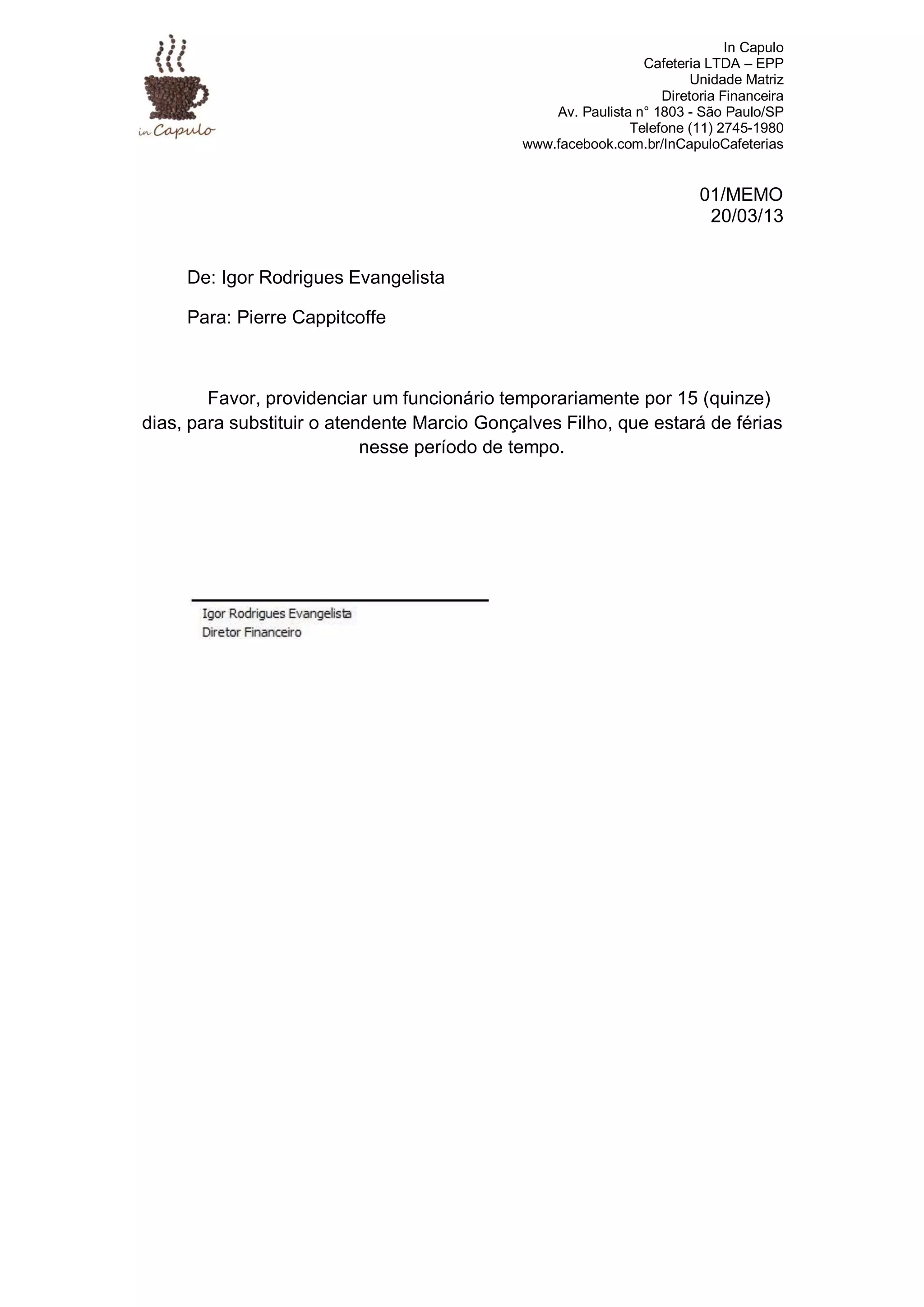 A empresa In Capulo Cafeteria LTDA solicitou um funcionário temporário por 15 dias para substituir o atendente Marcio Gonçalves Filho, que estará de férias nesse período. O memorando foi enviado de Igor Rodrigues Evangelista para Pierre Cappitcoffe em 20 de março de 2013.