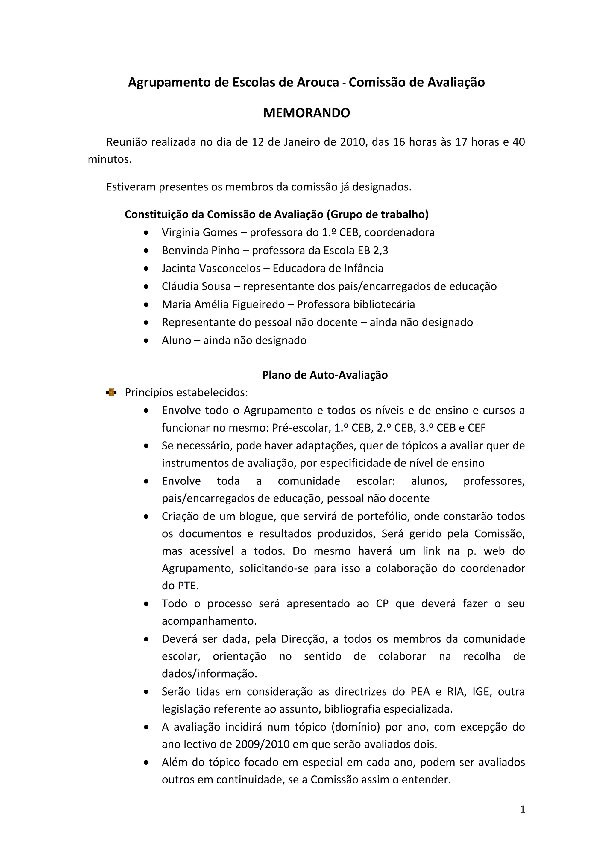 A Comissão de Avaliação do Agrupamento de Escolas de Arouca reuniu-se para constituir o grupo de trabalho e estabelecer o plano de auto-avaliação da escola. O plano abrange todos os níveis de ensino e envolverá alunos, professores, pais e funcionários. Nos próximos 4 anos avaliarão o sucesso escolar e a prestação de serviço educativo, analisando resultados, participação, comportamento e apoios disponibilizados.