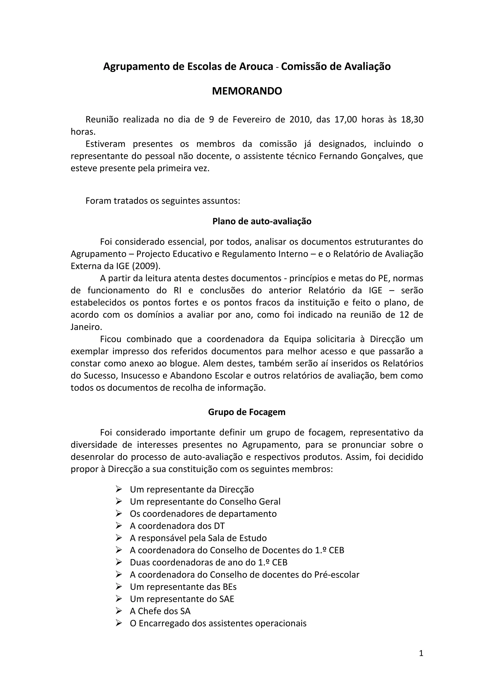1) A comissão de avaliação discutiu o plano de auto-avaliação, incluindo a análise de documentos estruturantes e a definição de pontos fortes e fracos.