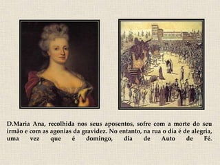 O capítulo descreve D. Maria Ana sofrendo com a morte do irmão e a gravidez enquanto as ruas celebram um Auto de Fé. Sebastiana Maria de Jesus é condenada por visões, enquanto sua filha Blimunda observa o evento com o padre Bartolomeu Dias. Blimunda e o ex-soldado Baltasar se atraem, ela o convida para sua casa onde o padre os abençoa como casal. À noite, Blimunda entrega sua virgindade a Baltasar e desenha uma cruz em seu peito