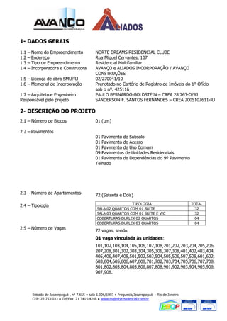O documento fornece detalhes sobre o empreendimento residencial Norte Dreams Residencial Clube, incluindo sua localização, incorporadora, número de blocos e apartamentos, tipologias, áreas comuns e especificações dos acabamentos.