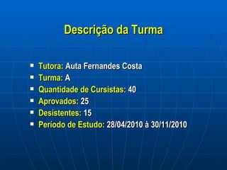 O documento descreve um curso de formação de professores sobre o uso de tecnologias da informação e comunicação (TIC) na educação no estado de Paraíso do Tocantins, Brasil. O curso teve 40 participantes, 25 concluintes e 15 desistentes, e objetivou ensinar professores a usar recursos tecnológicos de forma a dinamizar suas aulas e melhorar a aprendizagem dos alunos. O curso obteve sucesso, mas também enfrentou desafios como falta de infraestrutura digital nas escolas.