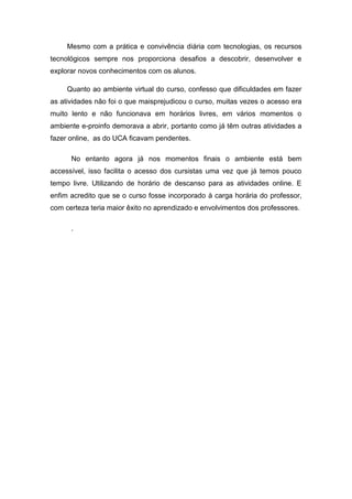 O documento discute a importância da tecnologia na educação e como professores devem usá-la de forma efetiva para permitir que os alunos se tornem usuários qualificados e cidadãos informados. A autora também descreve como as atividades do curso foram criativas e motivadoras e proporcionaram novos conhecimentos, e elogia os recursos do Portal do Professor. No entanto, ela relata dificuldades com o acesso lento ao ambiente virtual do curso.