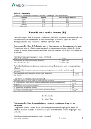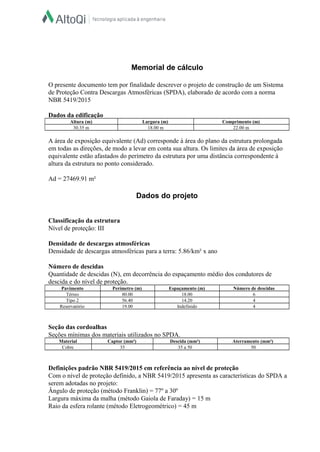 Este documento descreve o projeto de um sistema de proteção contra raios (SPDA) para uma estrutura de 30,35m de altura, 18m de largura e 22m de comprimento. Ele fornece detalhes sobre os cálculos de risco de acidentes e danos causados por descargas atmosféricas, de acordo com a norma brasileira NBR 5419/2015.